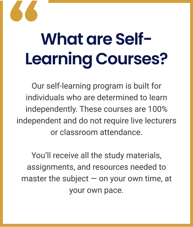 Our self-learning program is built for individuals who are determined to learn independently. These courses are 100% independent and do not require live lecturers or classroom attendance.